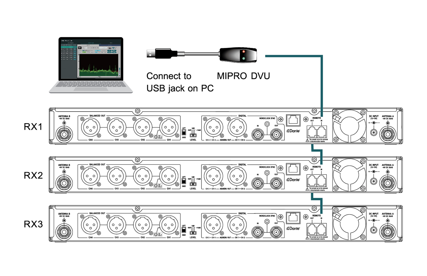 - Connects receivers to a computer via the MIPRO DVU adapter, managing up to 64 channels simultaneously with the ability to create, download, and store parameter profiles.