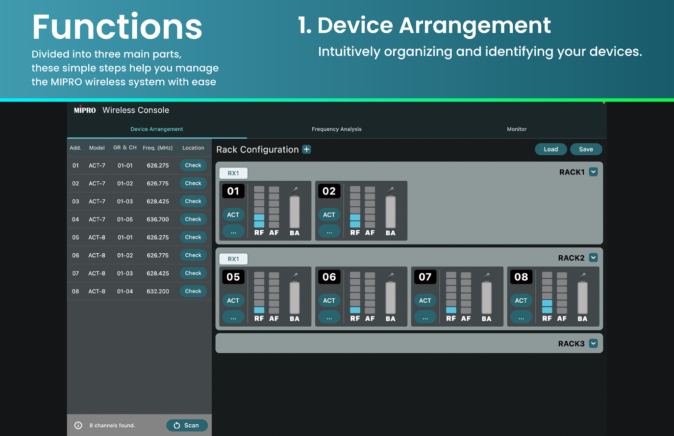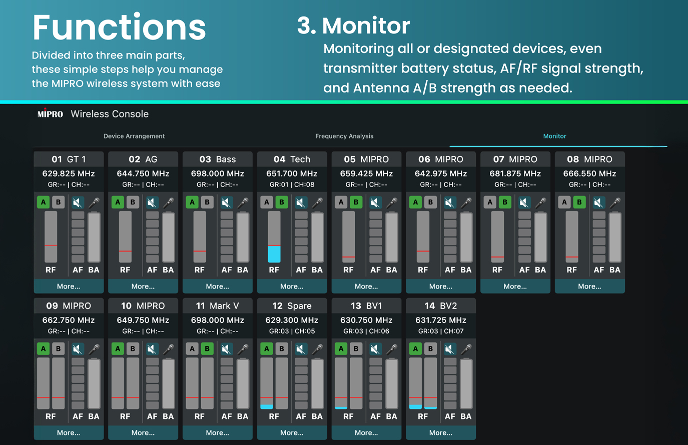 - MIPRO Wireless Console (MWC) is a new computer monitoring interface supporting ACT-800, ACT-700, and ACT-500 Series, simplifying multi-channel system management.