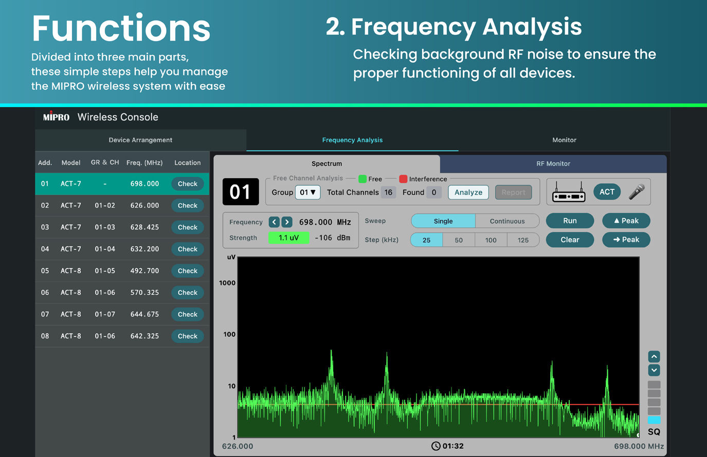 - Features a built-in spectrum analyzer with auto-scan to quickly plan interference-free frequencies while monitoring background noise and RF interference in real time.