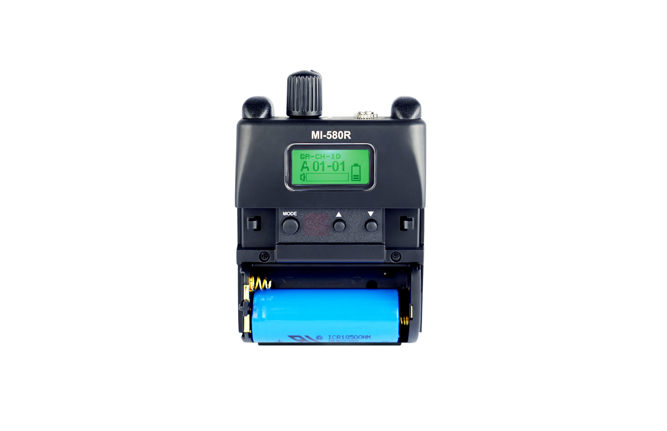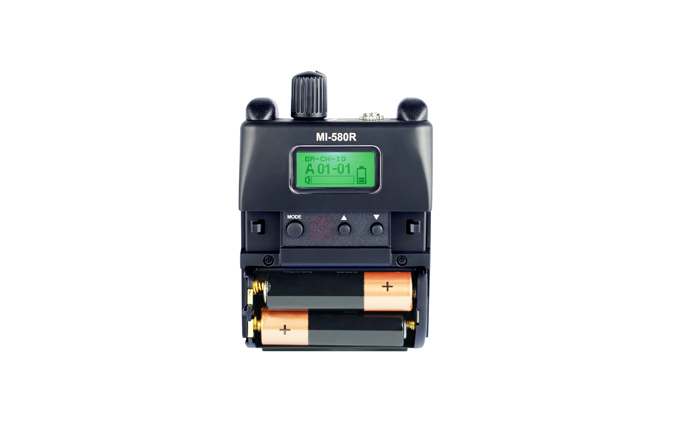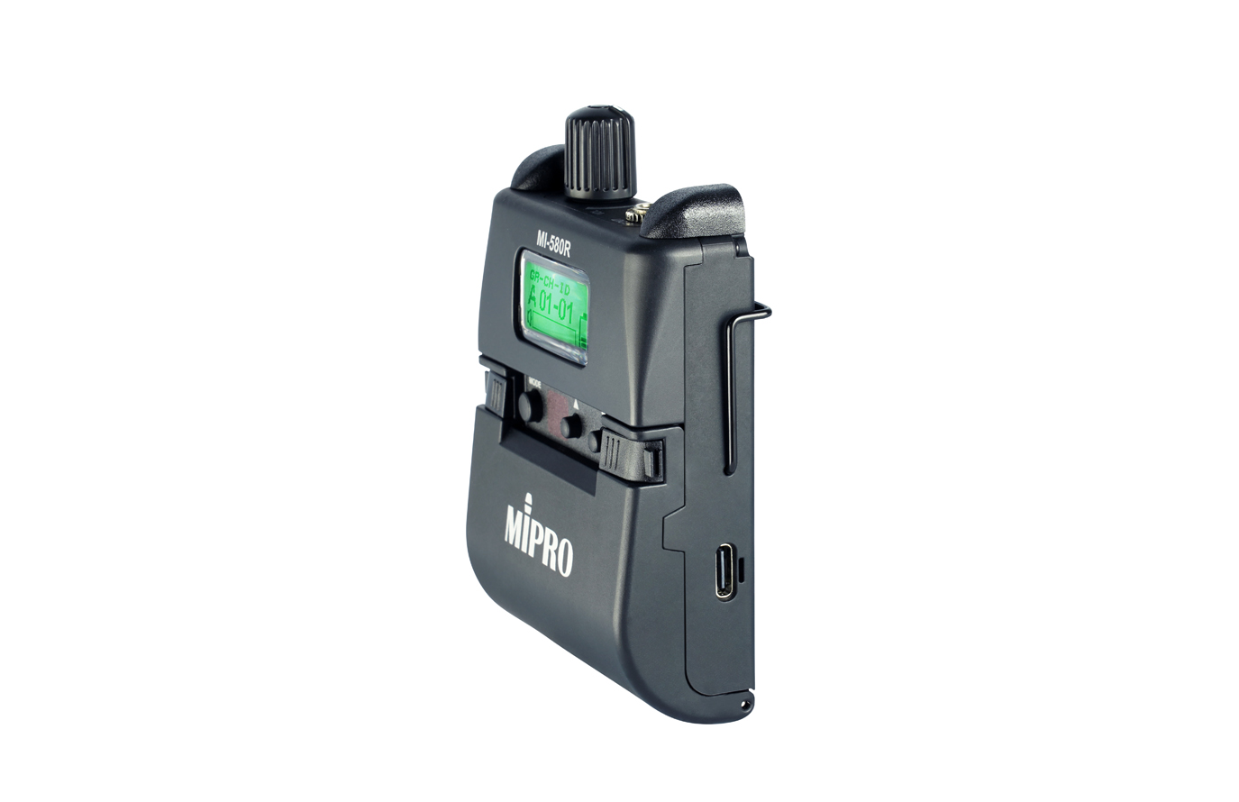 - 3.5 mm stereo earphone jack compatible with MIPRO professional monitoring earphones and most commercial models.