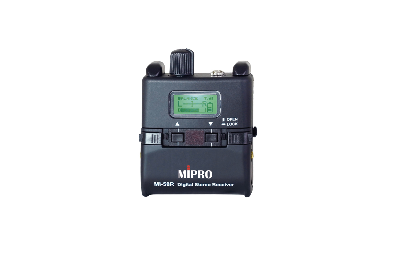 - 3.5 mm stereo earphone jack compatible with MIPRO professional monitoring earphones and most standard earphones.