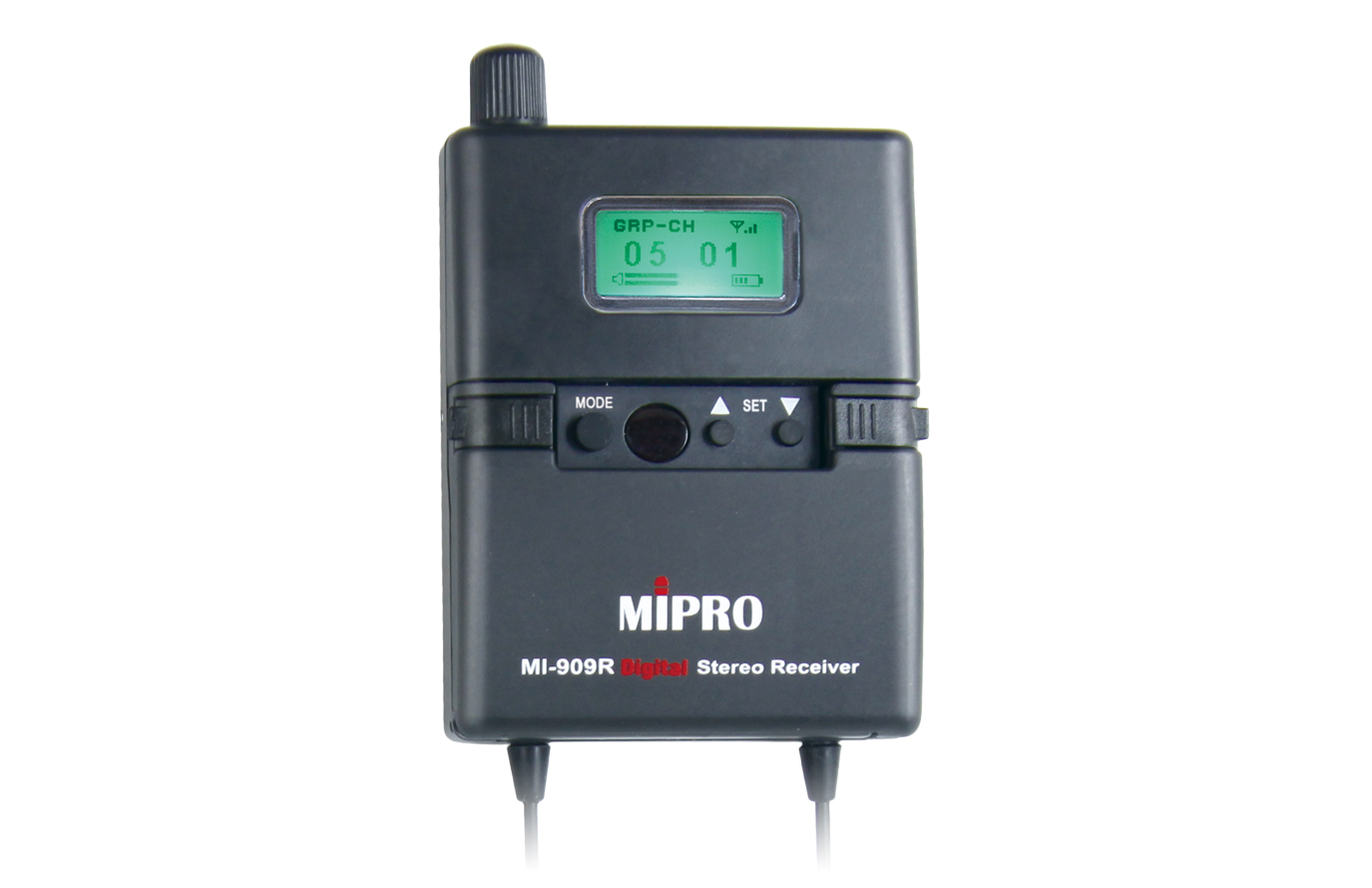 - 3.5 mm stereo earphone jack compatible with MIPRO professional monitoring earphones and most commercially available models.