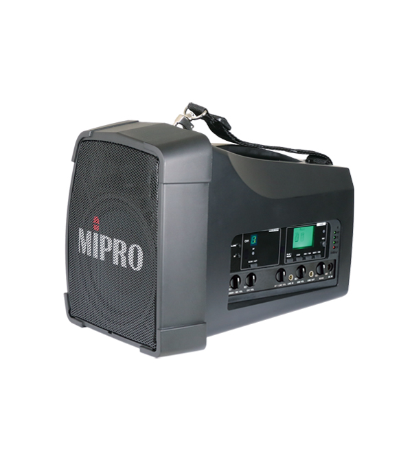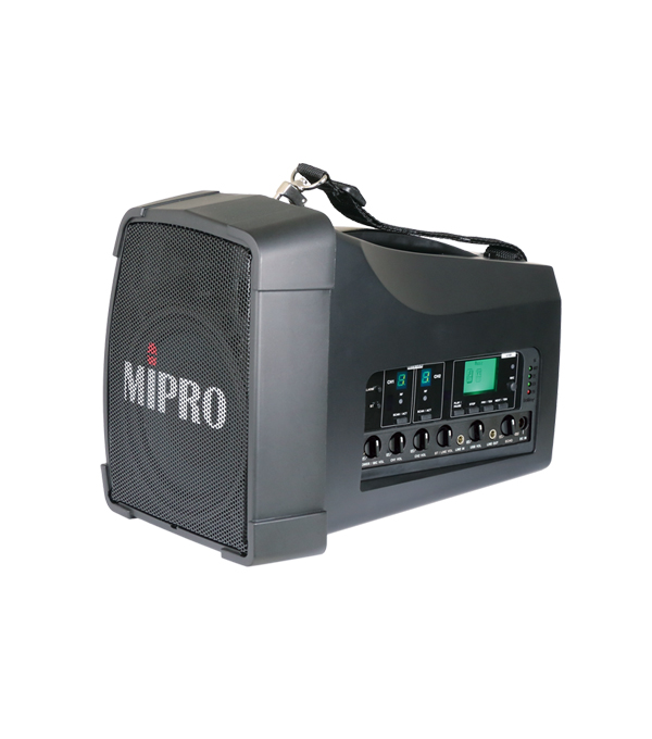 Dual-speaker wireless PA systems with UHF/ISM options, MP3, Bluetooth, echo, and rechargeable battery. MA-200D features dual-channel reception.