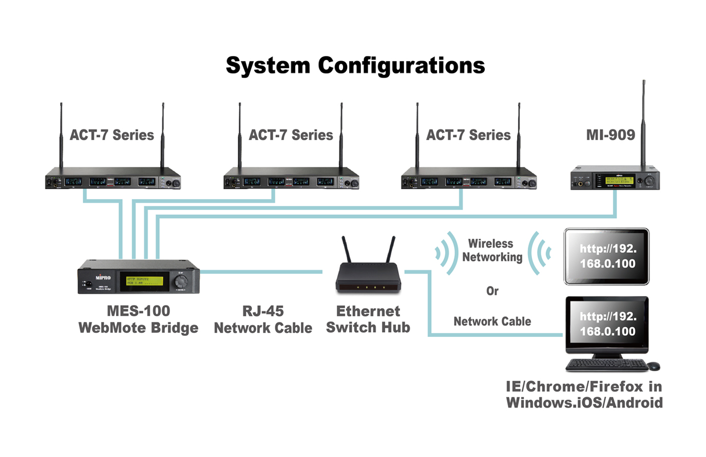 - 為 ACT 系列接收機設計的 ACT-BUS 遠端監控系統,結合 MES-100 網頁橋接伺服器,即可將監控內容自動轉換為網頁。