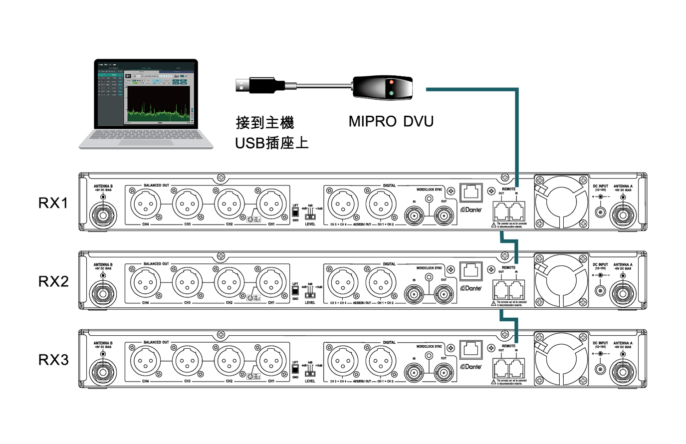 - 透過 MIPRO DVU 轉接頭連接電腦與接收機,最多可同時管理 64 個頻道,並能建立、下載及儲存參數設定檔。