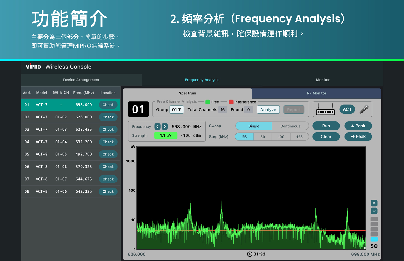 - 內建頻譜分析儀,具自動掃描功能,可快速規劃互不干擾的頻率,並即時監控背景雜訊與干擾訊號。