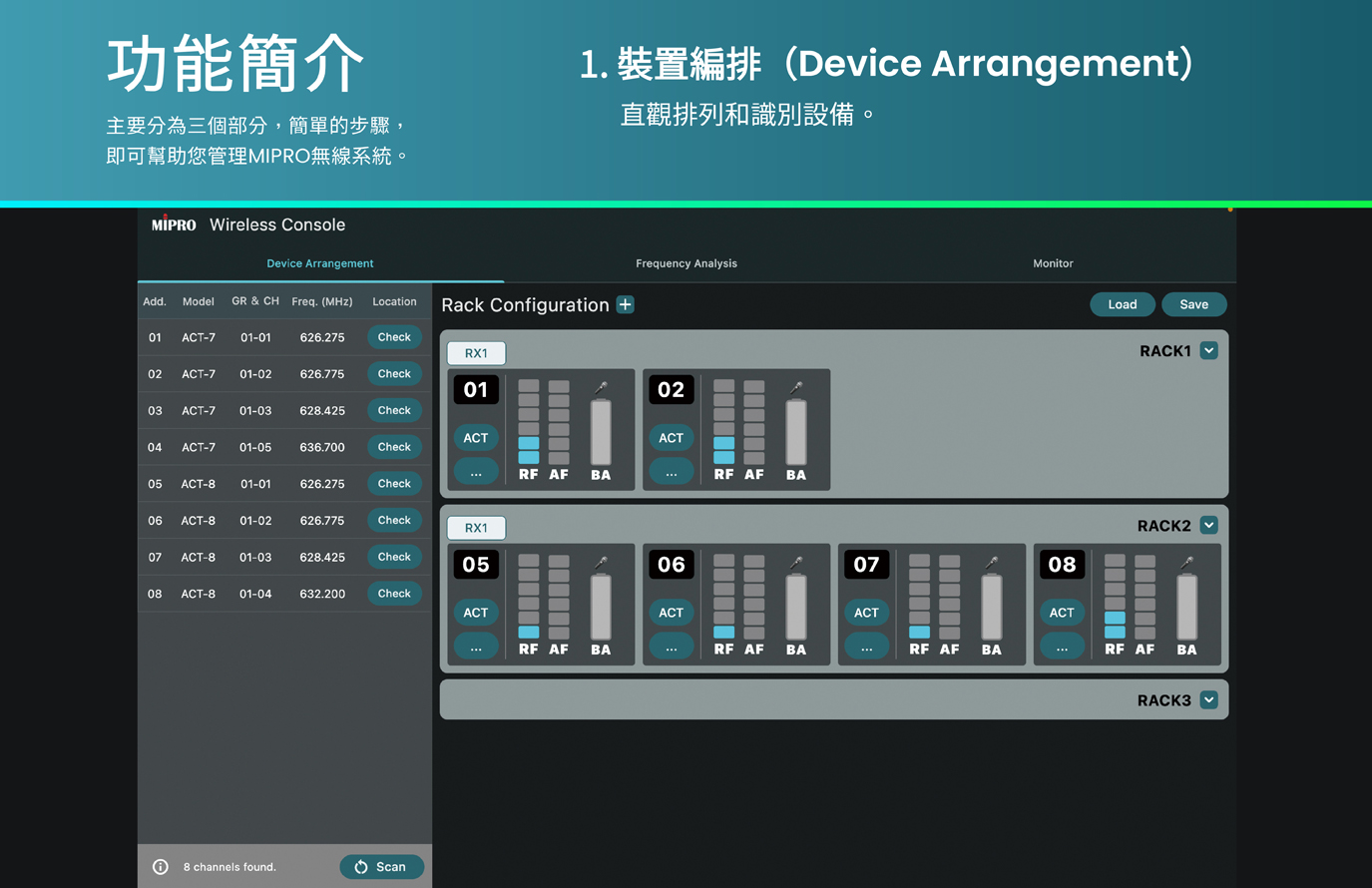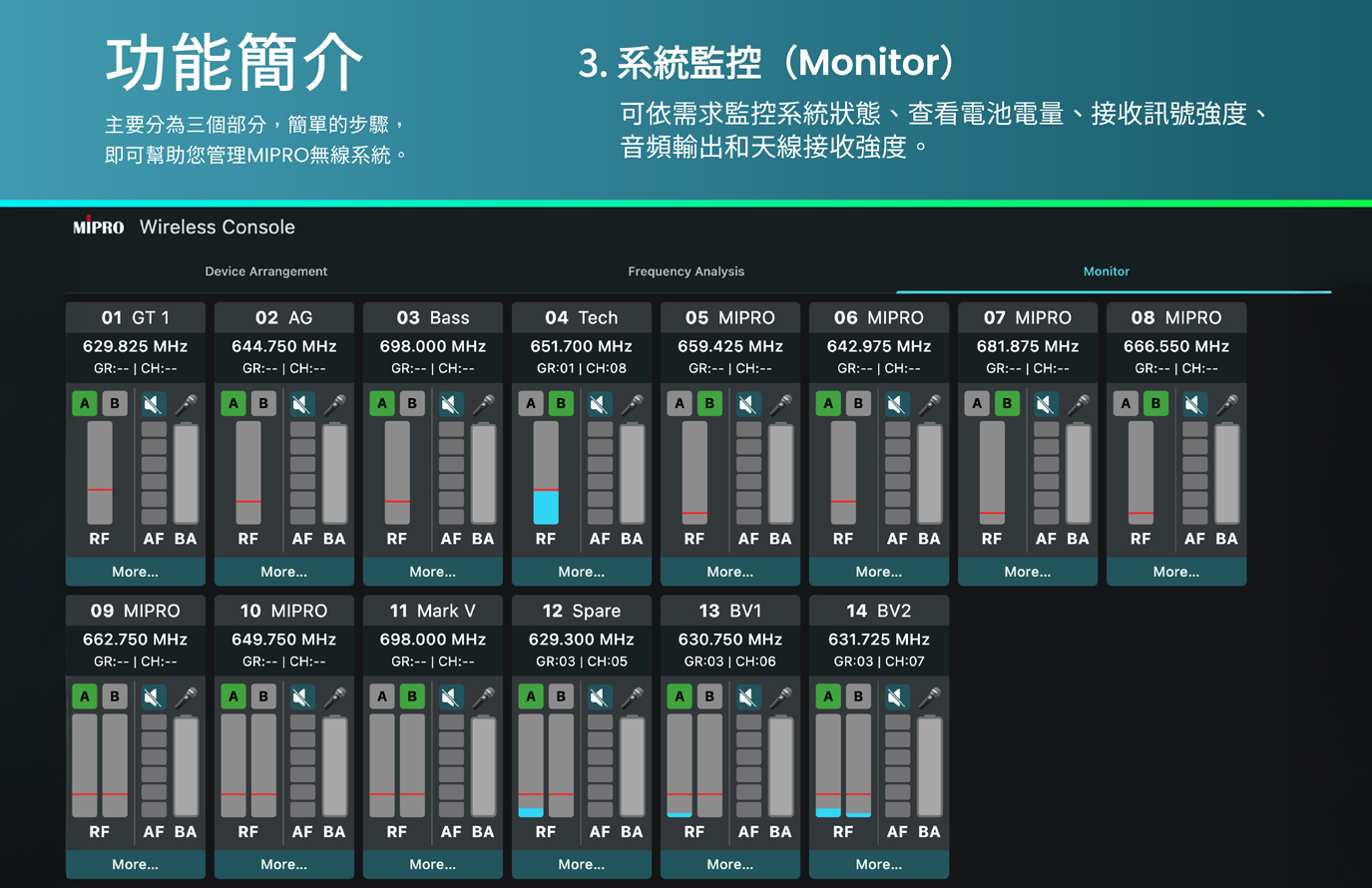 - MIPRO Wireless Console(MWC)為全新的電腦監控介面,支援 ACT-800、ACT-700、ACT-500 系列,輕鬆整合多頻道系統。