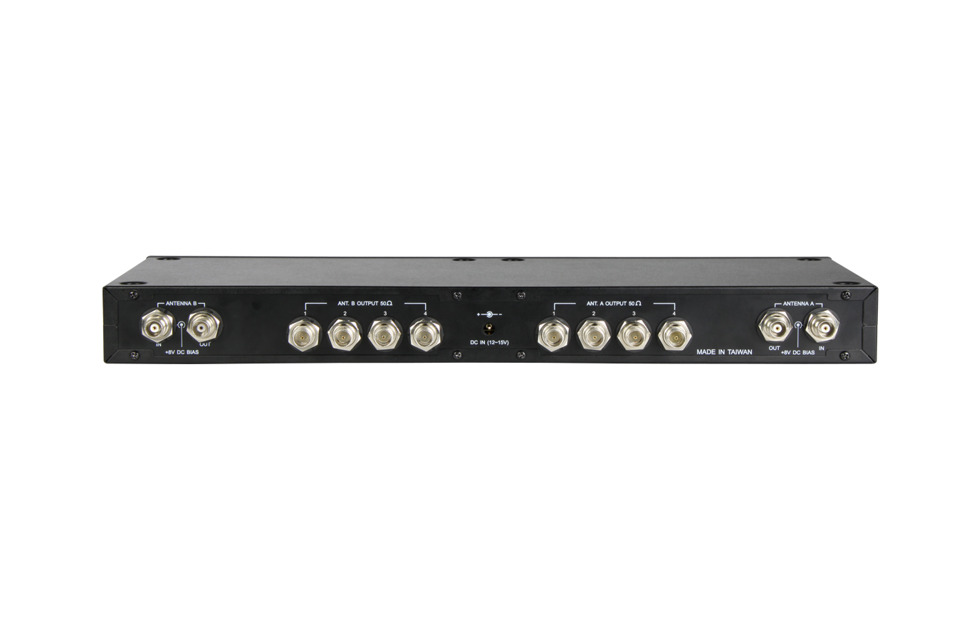- 可將兩組天線訊號輸入後分配至四台接收機,並可串接其他分配器擴充系統。