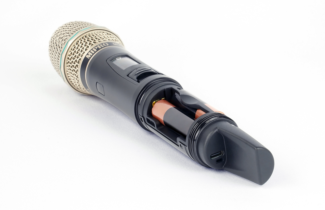 - ISM 數位系列專用手握式發射器,搭配 MIPRO 2.4 GHz 系列接收機與擴音機,適用於教學、簡報與小型會議空間等場域。